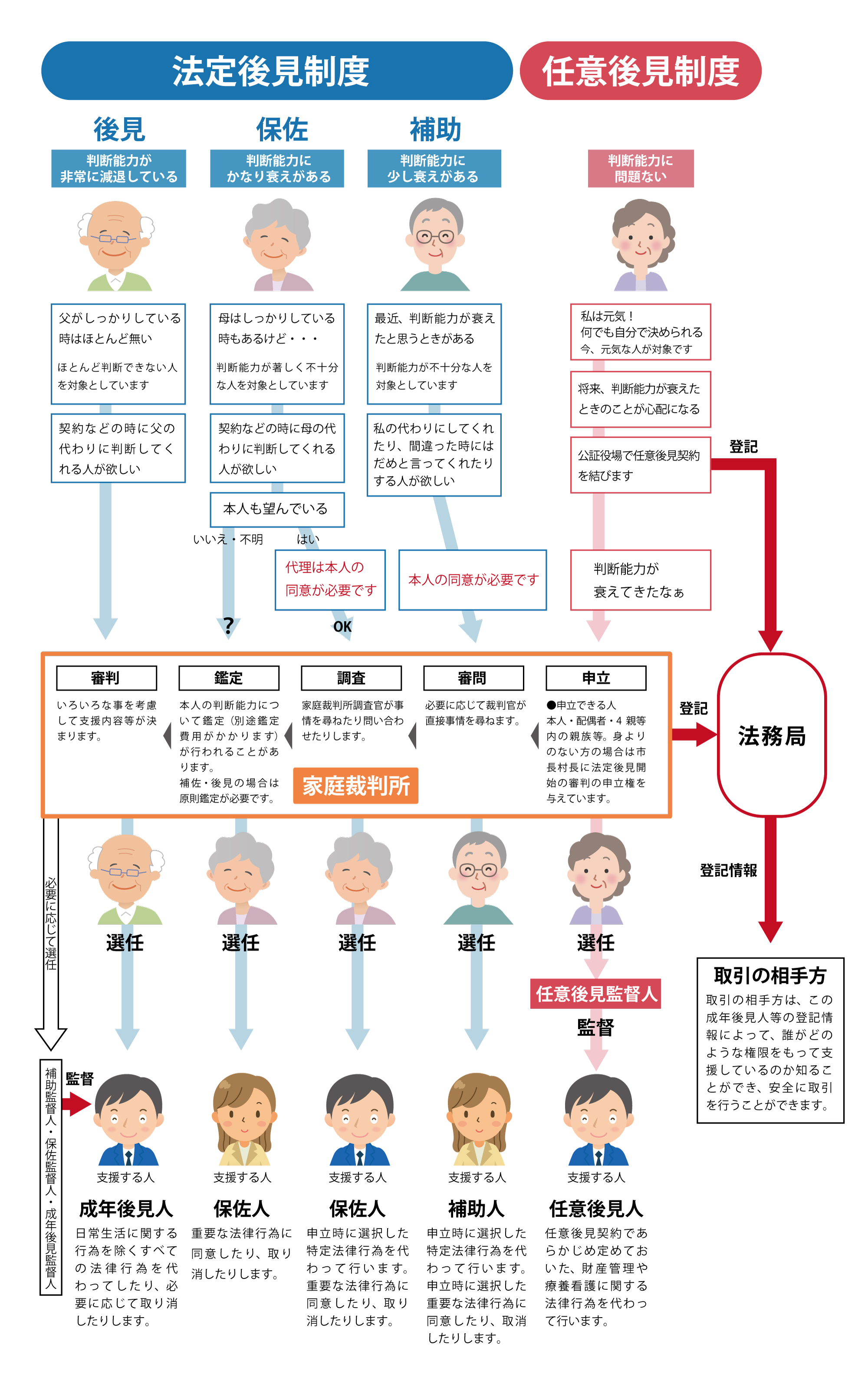すでに判断能力が衰えている方のために、家庭裁判所が適切な支援者を選ぶ制度です。選ばれた支援者は、本人の希望を尊重しながら、財産管理や見のまわりのお手伝いをします。本人の判断能力の程度に応じて、次の3つのタイプに分けられます。